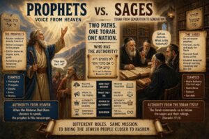 Ober, which is a “higher” connection to the RBSO? Shoin, that seemingly depends on the category. If asking, who knows the RBSO’s current message? The Novee. If asking: Who decides halocho? The sages. They argue the famous principle of לֹא בַשָּׁמַיִם הִוא – Loi bashomayim hi, meaning “It is not in Heaven.” Famous from where? From the Heyilge Gemora itself where its iconic use can be found in Buba Metzia 59b, and where, after miraculous signs in a particular dispute, a Heavenly voice supported Rebbe Eliezer. Rebbe Yehoshua stood and said לֹא בַשָּׁמַיִם הִוא. Once the Toirah was given, halachic decisions are made through the rabbinic legal process, not by prophecy. Meaning, even if a prophet had a heavenly message, he could not permanently overturn Toirah law through prophecy. Some prophets were great sages; some sages were spiritually greater than many prophets. The heylige Gemora (Bava Basra 12a) -of course- says that in some ways a sage is greater than a prophet אָמַר אַמֵימָר: וְחָכָם עָדִיף מִנָּבִיא. (Ameimar said: A sage is superior to a prophet) because wisdom in Toirah can exceed prophetic function. Naturally, the people writing the Gemora found much to admire in sages. A shtikel self-serving, you think?! The bottom line: The Novee has authority from hearing from Heaven. The sages have authority from the Toirah system Heaven established. Or, better said, the prophets delivered the RBSO’s messages while the sages determine the RBSO’s laws. Veyter.