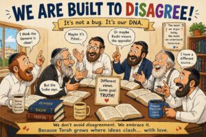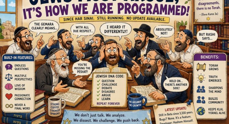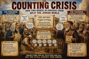 The debate between me and my son-in-law, you see, was simply a continuation of an argument already fought by the Perushim, the Tzedukim, and other factions in Temple times. They argued over these very words. They argued over the calendar. They argued over Shavuis, argued over authority. Apparently, factionalism did not begin with shul board politics or elections. Even then, the Yiddin could not form one group without first splitting into four subgroups and a committee. If there were ten Jews in Yerusholayim, historians found twelve opinions. Shoin, it’s how the RBSO programmed us. And we, heading toward Midtown Manhattan, merely kept the mesorah alive. So, before we discuss how one phrase split a nation, we first need to meet the players:
