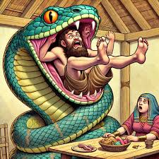 Though chopped down to size, and now but a slithering shell of himself, the snake does appear one more time in Bereishis. We met him when Yoisef’s holy brothers –let’s give them one more shout out- who out of sheer jealousy, threw their little brother into a pit. Rashi tells us the pit had no water; it did however contain snakes and scorpions. Yikes! The RBSO made sure Yoisef was safe; he went on to become a hero for the Jewish people, as well for the goyim. Gishmak. In its two Bereishis appearances, the snake -as employed by the RBSO- appears once with sexual desires on Chava. Says the medrish that the snake’s mission was to seduce Chava and share his emission, if you chap. That same medrish tells us he was successful and that Chava actually gave birth to various semi-human creatures. Only after another 130 years elapsed did she give birth to another human son. As an aside, at least one medrish (Pirkei D Rebbe Eelezer) tells us that Kayin was born out of a shtikel relationship between Chava and the snake. Hec, it’s medrish where seemingly anything goes and comes, if you chap.  And if you think that medrish is out there in lala -land- mamish beyond the pale- another tells us that the snake was even more nefarious. With an eye on Chava, and knowing that eating the forbidden fruit would certainly cause instant death (so the RBSO explicitly warned Odom), he intended to have Odom killed by passing her the forbidden fruit which she would then pass onto her husband. And then? With Odom dead, the snake planned to marry Chava! Mamish a snake! You hear this raboyseyee? The snake wanted the woman. The bottom line: when a snake wants a woman, if you chap, it will stop at nothing; it will say anything, do anything, spend money, dress up or down, and more; it stops at nothing. And that’s taka how it’s been ever since!